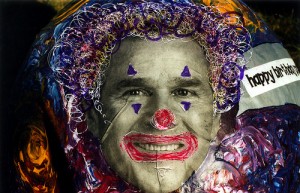 An anti-war collage, with scratch animation on the face of George W. Bush.